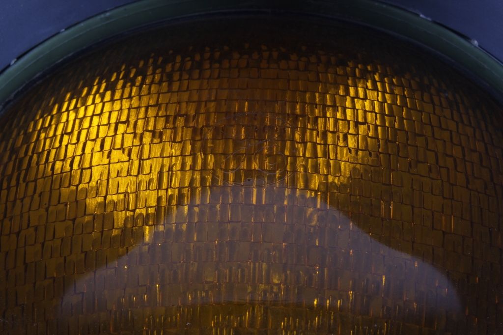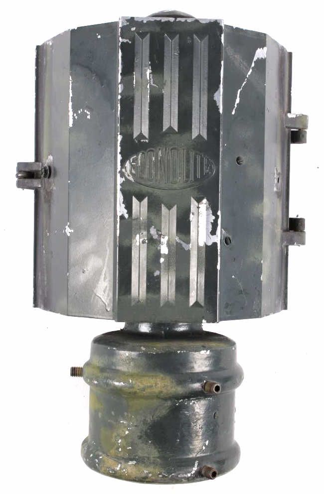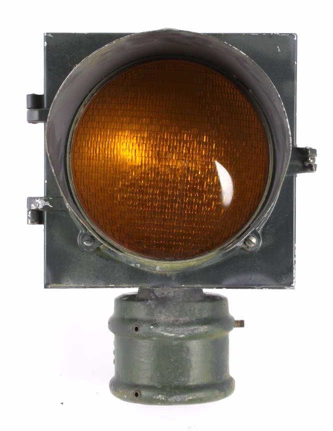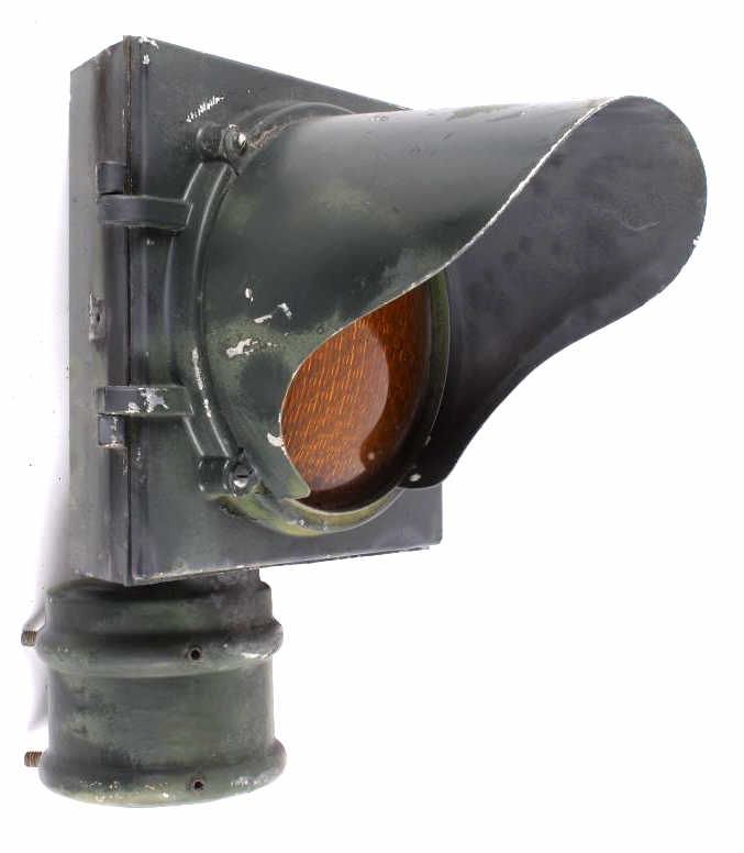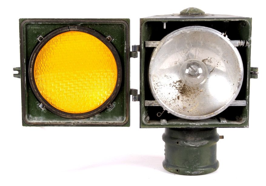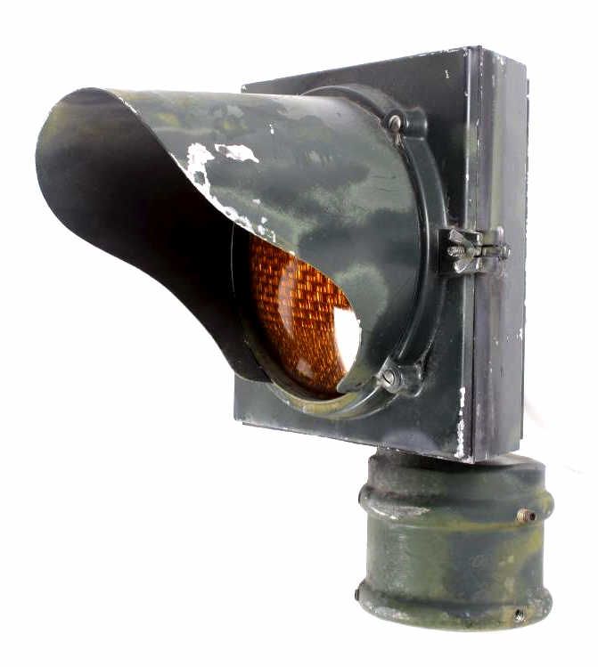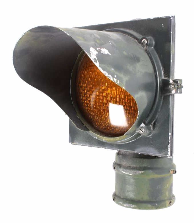 This is an original metal Caution Traffic or Railroad Light collected in Montana. The piece has a green coloring with a yellow glass shade and is believed to be from the 1940's. This collectors piece measures 15"x16.5"x11.5"