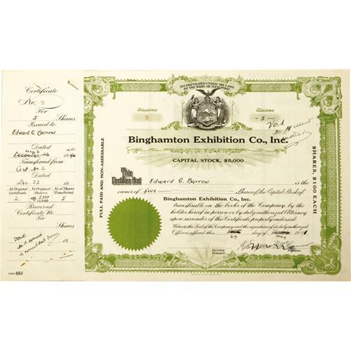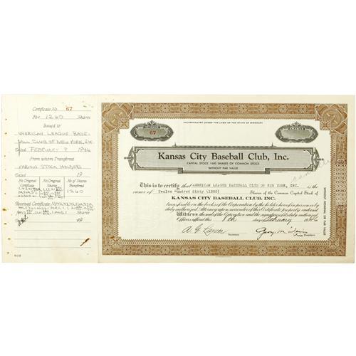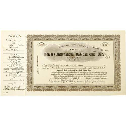 <B>1940's Ed Barrow Signed and Personally Owned Stock Certificates Lot of 4.</B></I> Intriguing selection of four stock certificates relate to the Hall of Fame executive's personal ownership of shares, or management, of New York Yankees farm clubs. 1) 1941 Newark International Baseball Club. Signed by both Barrow and fellow Hall of Fame executive George Weiss. Signatures have been voided. Receipt has second voided Barrow signature. 2) 1946 Kansas City Baseball Club. Signed by Weiss (9/10). 3) 1947 Kansas City Baseball Club. Signed by Barrow (10/10). 4) 1941 Binghamton Exhibition Co. Issued to Barrow. No noteworthy autographs. All certificates remain in strong condition, with no troubling condition issues. Some great Yankee minor league history here, and tough, quality autographs too. <I>LOA from PSA/DNA.</B></I>