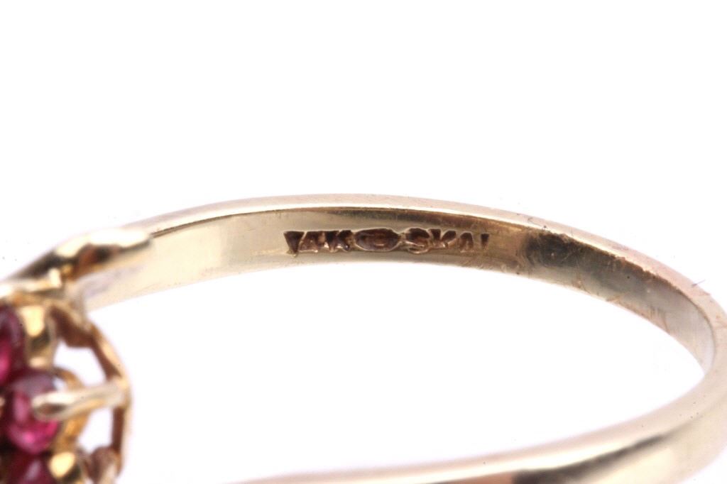 Included in this lot is a beautiful, vintage 14k gold, diamond, and spinel flower ring, circa 1940's. This ring features five small spinel stones that surround one diamond stone, making a flower shape. This ring displays a gold bypass style band, with the inside of the band marked "14K SKAI". This ring is in excellent condition for its age and shows no sign of damage or wear. This ring measures US size 8.