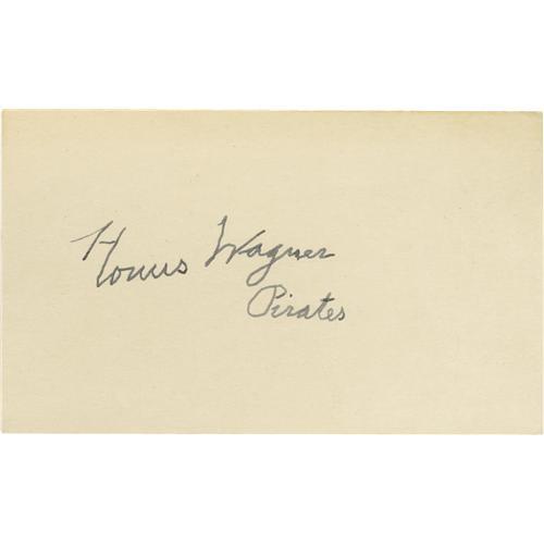 <B>1940's Honus Wagner Signed Index Card.</B></I> For half a century this early legend wore the uniform of the Pittsburgh Pirates, and here he proudly notes that affiliation along with his 10/10 black ink signature applied to a blank 3x5" index card for an autograph seeker. A thin band of toning along the card's upper edge is noted for the sake of accuracy, and does not adversely affect the display. <I>LOA from PSA/DNA. LOA from James Spence Authentication.</B></I><BR><BR><b>Shipping:</b> Flat Material, Small (<a target="_blank" href="http://www.heritageauctions.com/common/shipping.php">view shipping information</a>)