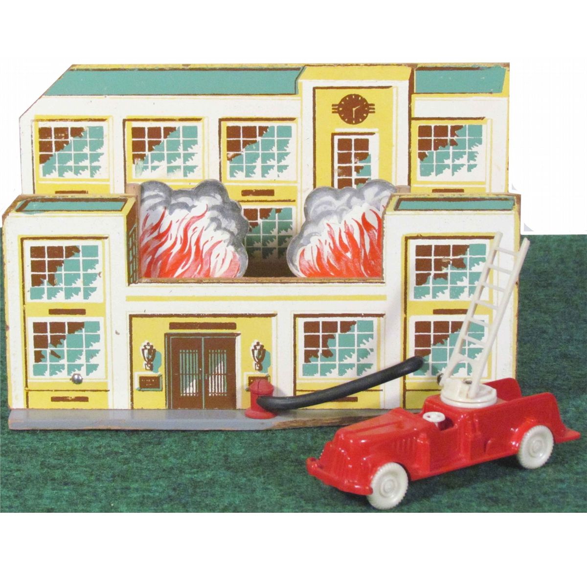 1940's Toy Keystone Burning House with Fire Truck. Very good all original condition. 9 X 6 X 4 inches.