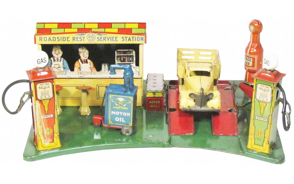 1940's Louis Marx Roadside Rest Service Station Toy. Tin litho, electrified. Excellent condition. 14 X 6 X 10 inches.
