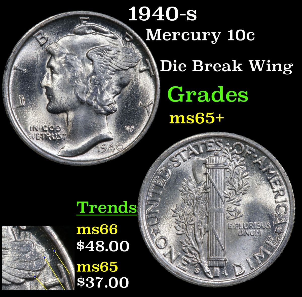 1940-s Mercury Dime 10c Grades GEM+ Unc.