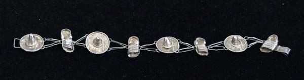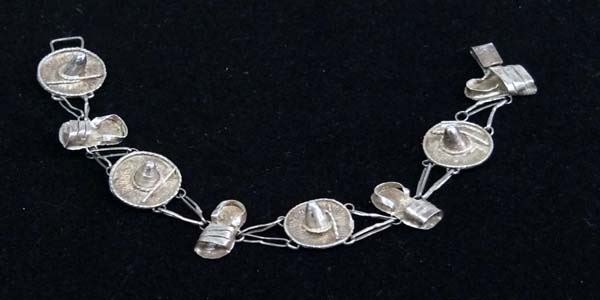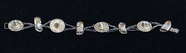 Sweet 1940's Mexican Sterling Silver Link Bracelet, measures 7.5''L x .75''W, stamped Silver Made in Mexico, embellished with little sterling sombreros and huarache sandals, 8.57g in total wt.