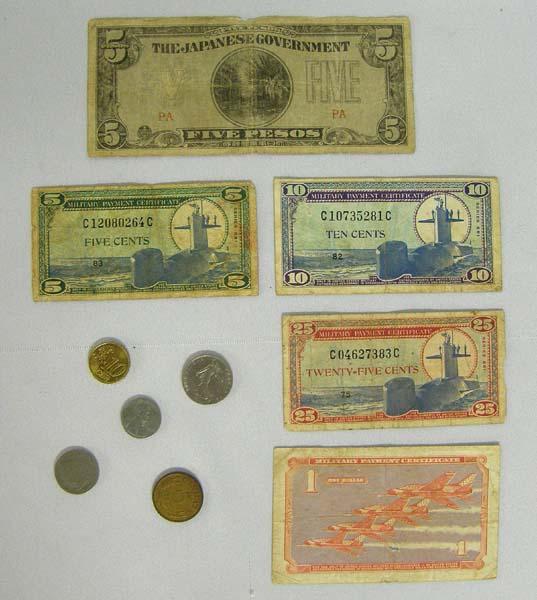 1940's Military Paper and Coin Money in Riker Box, 10 pieces. SHI $20.