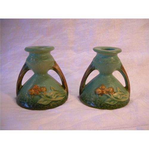 Up for sale is a pair of Late 1940's Roseville Bittersweet Candlesticks. Condition is excellent; there are no chips, cracks or repairs and very-very minor crazing. Both are marked on the bottom with Roseville U.S.A. and the # 851-3". They actually measure closer to 3.25" tall, rather than there listed 3". If you have any other questions, feel free to email us. Thanks for looking!