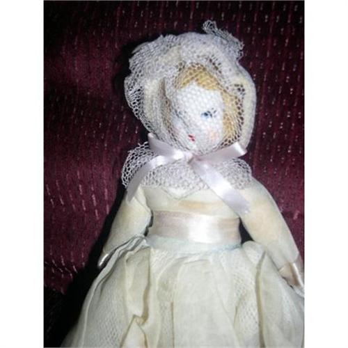1940's Ruth Gibbs Blonde W/ Netting. She is the white china with the blonde hair and matching painted mustard colored shoes. The outfit is all original and she has the name Sally on her dress. These were dolls that could be "named" with the child's name put on the skirt. There dress is faded as it was original a light blue as you can see in the picture when the doll is shown from the back. The doll has original blue net pantaloons. The body is a white cotton. She is sold as is. No damage to the china. Doll comes from a smoke free environment. Buyer to pay 10.00 shipping, handling, and insurance. Thanks for viewing.