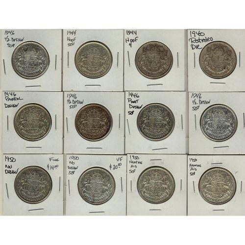 1940 to 1950 50¢. Lot of 12 coins including 1940 Rotated, 1944(2) Hoof, 1946(5) half design and 1950(2) Hearing aid and 1950(2) No Design.