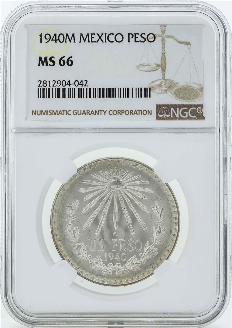 One 1940M Mexico Peso Silver Coin NGC MS66. NGC Certified.