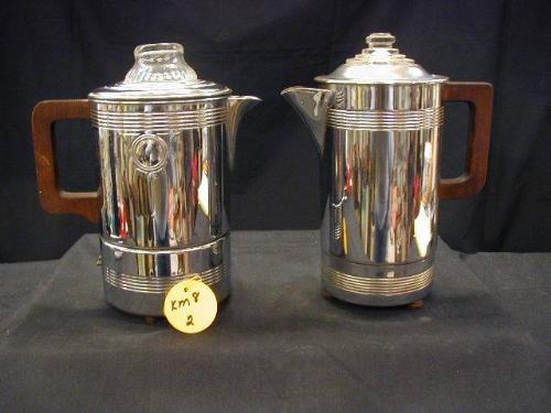 1940'S CHROME COFFEE POTS INCLUDES (1) ART DECO INSPIRED WESTINGHOUSE COMPLETE COFFEE POT W/ WOOD HND., (1) UNIVERSAL CHROME COMPLETE COFFEE POT W/WOOD HND. EXCELLENT! COMPLETE MEANS W/CORDS!, 2 PC