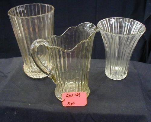 1940'S CLEAR PRESSED GLASS INCLUDES 9in VASE, 7 1/2in VASE, 8in FTD PITCHER, 3 PCS