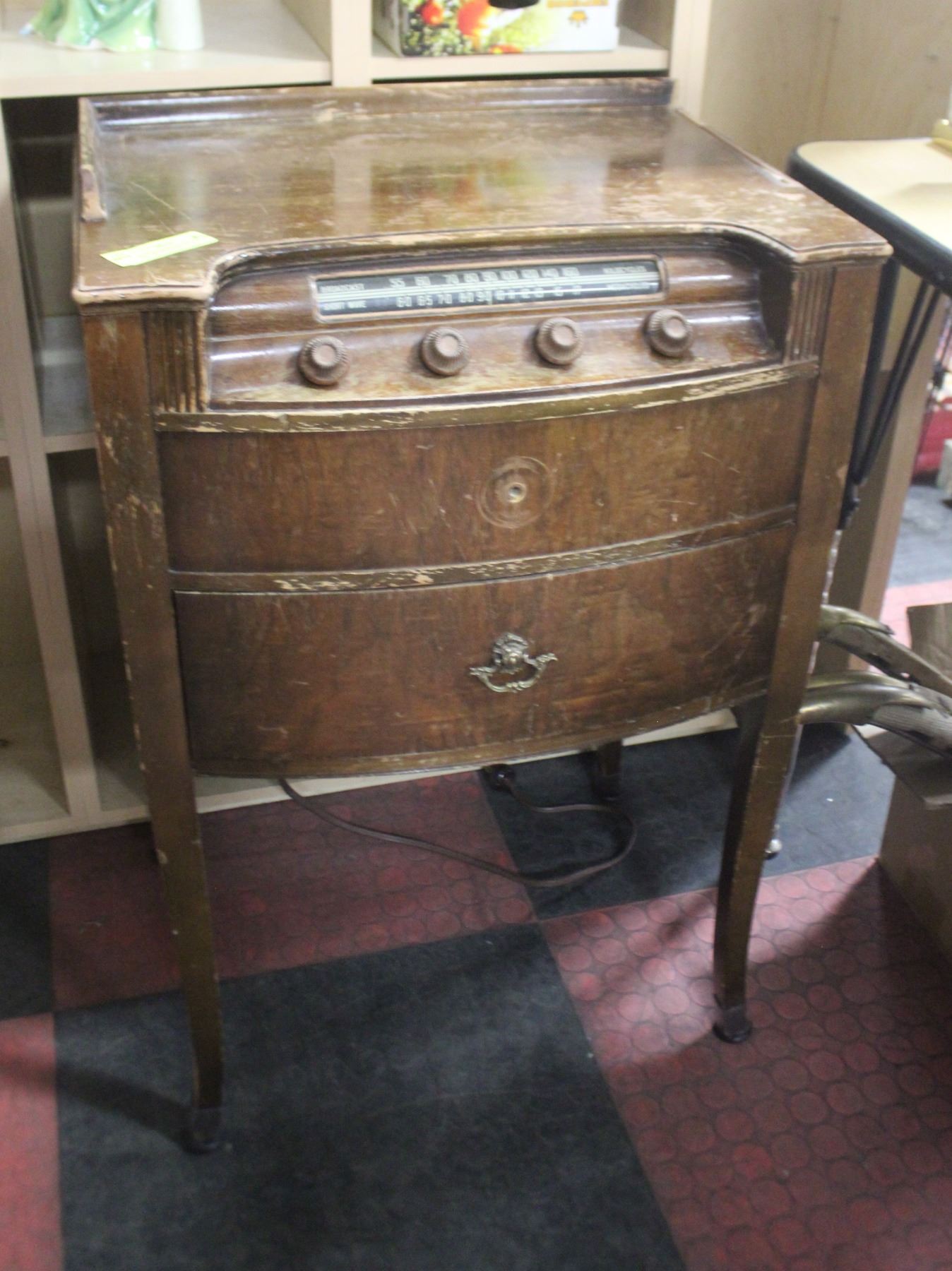 & RECORD PLAYER WALNUT FLOOR MODEL WORKING CONDITION. 21”X 16” X 32”. CABINET NEEDS REFINISHING.
