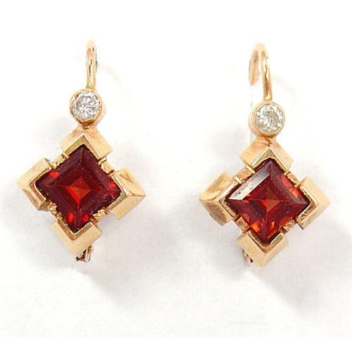 Austrian classic, bold, sharply geometric pink 14kt gold earrings. Diamond-shaped faceted garnets are prong set below smaller faceted bezel-set diamonds. Angular pink gold frame sets off the garnets, while open backs allow light to highlight both diamonds and garnets. European backs. The Austrian hallmark and maker mark are clearly visible on the posts. Size: 0.75" from top of the earwire, 14mm from dia. 11mm across