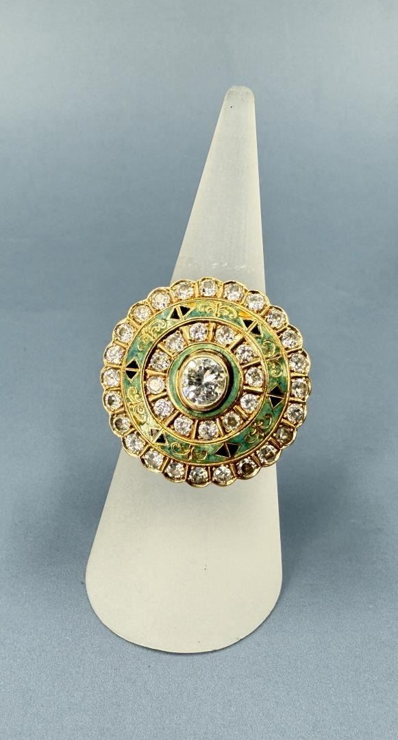 Center stone is .64ct Emerald Cut, H-I Color, I1-2, diamond is chipped and needs polished. The surrounding stones have a total weight of 1.01ct, Old Mine Cut, H-I Color, SI2-I2 clarity. 10.47 grams. Size 8. Comes with appraisal report for $6375.