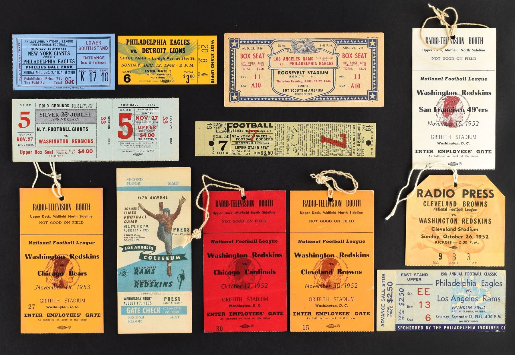 NFL Games - 1941 NFL Championship game pass (given out at half time by ushers for re-admittance), 9/24/33 NY Giants at Portsmouth Spartans - Universal Stadium, OH (GD, paper on reverse, crease), 12/2/34 Giants at Eagles (NM), 8/29/46 Rams at Eagles Benefit Roosevelt Stadium NJ (EX), 12/7/47 Yankees at Dodgers - Ebbets Field - FULL TICKET (EX), 12/12/48 Lions at Eagles (EX/MT), 11/27/49 Redskins at Giants - Polo Grounds (EX), 9/13/52 Rams at Eagles (VG - tab loose but intact), 8/17/55 Redskins at Rams Charity Benefit (EX, tab loose but intact), 10/19/58 49ers at Eagles (EX), 9/25/60 Browns at Eagles (VG/EX), 11/11/62 Packers at Eagles (EX), 10/14/73 Redskins at Giants (EX), 7/28/73 Patriots vs 49ers - Hall of Fame Game - Canton OH FULL TICKET 9 EX), 12/9/72 Dolphins at Colts (2, both EX), 12/12/76 Seahawks at Eagles - 1st season Seattle (VG).