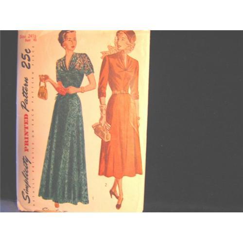 This vintage original sewing pattern, copywrited by Simplicity (no date given), features a glamorous evening gown or day dress with pretty pleated-style neckline and cuffs. The sleeves can be short or 3/4 length. The pattern is size 24 1/2, bust 43. It sold for 25 cents back in the day!