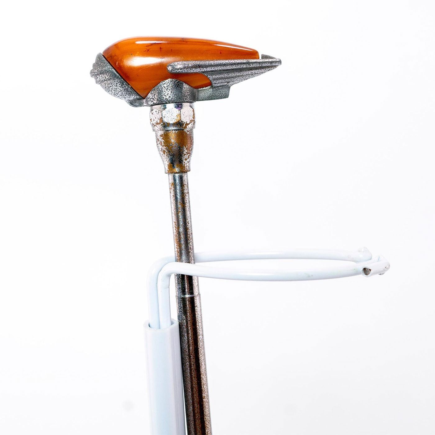 Fender guide with orange topper. Zeppelin style orange and chrome antenna topper on fender guide. Age and use related wear. Automobilia