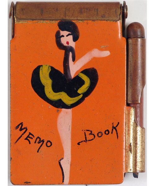 This is a vintage (1940s, we believe) Art Deco girlie mini memo book holder with a hand-painted pin-up girl on the front. It is made of metal and includes a miniature pad of paper and a miniature pencil. When the pencil is in place alongside the holder, the holder is kept closed; when the pencil is removed, the holder can be flipped open and the paper accessed. SIZE: Approx. 1 1/2" x 2 1/4".