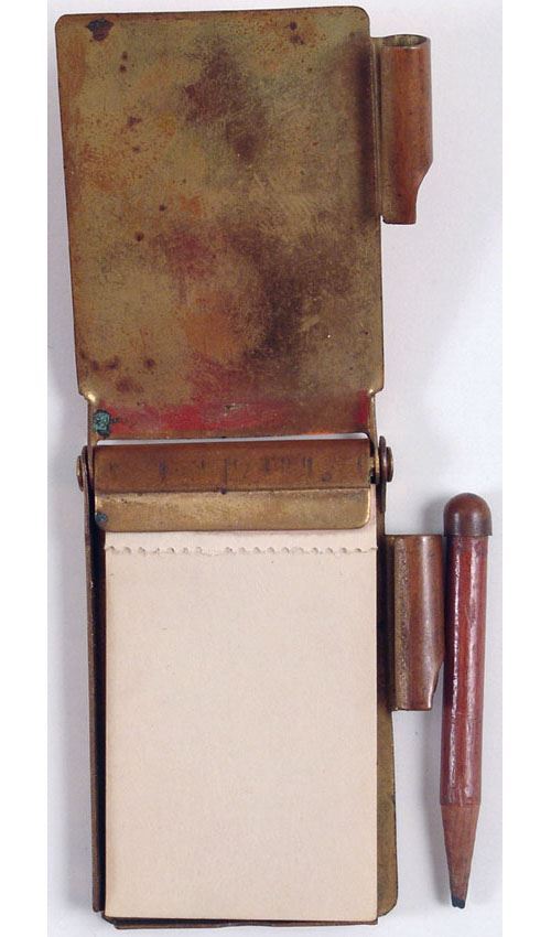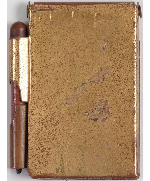 The cover is in excellent condition except for light surface wear, a few small scratches and nicks, and some paint loss along the top edge. The rest of the holder is in very good condition with some surface wear, some rust that we did not try to clean off, and some adhesive residue on the back that we did not try to remove. This is the first one of these that we have come across, and we felt it should be left in the condition that we found it in.