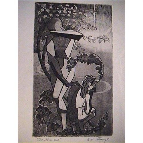 This is a piece by artist K.W. Strange (Kenneth Strange) from a portfolio found in a Maine estate. The portfolio contained a great variety of styles and periods of the artist work ranging from 1940s WPA to 1960s Modernist. This artist developed a creative and visually pleasing collection of work which we will be offering over the coming weeks. This piece is a wonderful, hand done, etching. The theme is a lady and a man in a cubist modern style, probably Adam & Eve. The print is pencil signed KW Strange and titled The Sinners. The print measures 13.25 x 10.5 inches. There is a little light expected age and wear to the paper, overall in very good condition. <p>Shipping and insurance are determined after checkout. <p>