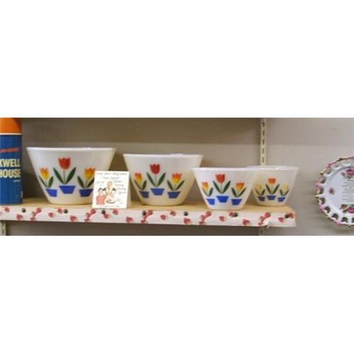 This is a set of four white "Tulips" Deep "Non-Splash" nesting mixing bowls by Fire-King and decorated by Gay Fad. They are 5 1/2", 6 1/2", 8 1/2" and 9 1/2". I believe the two smaller bowls are quite hard to find. I can't find a 5 1/2"bowl listed anywhere but I bought these as a set at an Estate sale and I am selling them as a four piece set. There are no chips or cracks on any of the four. The small 5 1/2" bowl does have wear to the tulips, the 8 1/2" has some paint missing on one of the green leaves and that's about it as far as I can see. The white bowls also seem to be harder to find than the Ivory.