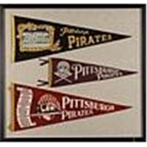 34" x 36" display featuring three vintage circa 1940s Pittsburgh Pirates felt pennants, measuring 21-1/2" x 29". One has a team picture mounted, another lists HOFer Ralph Kiner, Vic Lombardi and others. Pennants appear to be EXMT.