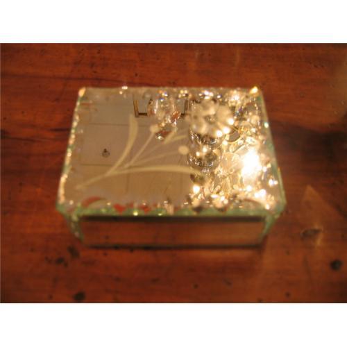 Precious 1940s French mirrored jewelry box. This one has scalloped, beveled mercury glass with an etched flower on the top and a lidded compartment.