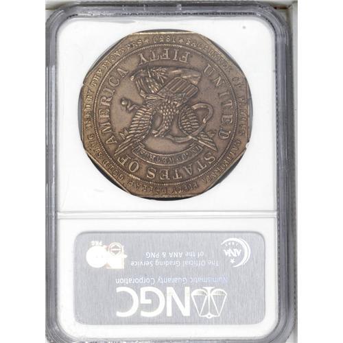 <B>(1940s) HK-502A Days of '49 Slug, MS62 NGC.</B></I> Issued during the California Gold Rush Centennial, these pieces have just recently been added to the "so-called" section. The obverse is a copy of the gold slugs of the 1850s. Unlisted in the standard 1963 Hibler-Kappen reference catalog. Viewing is recommended.