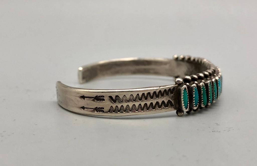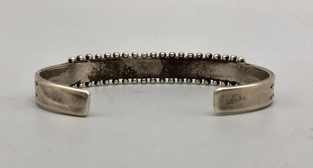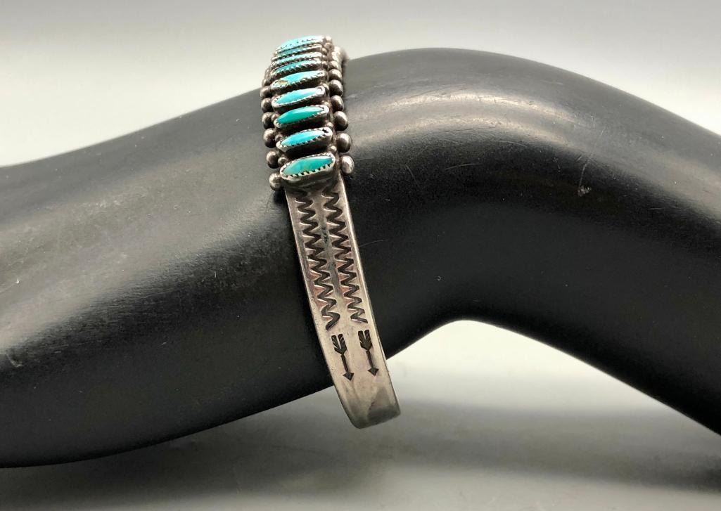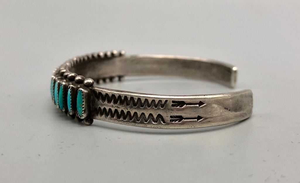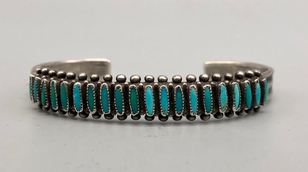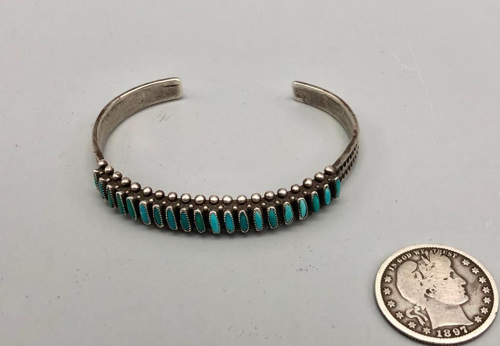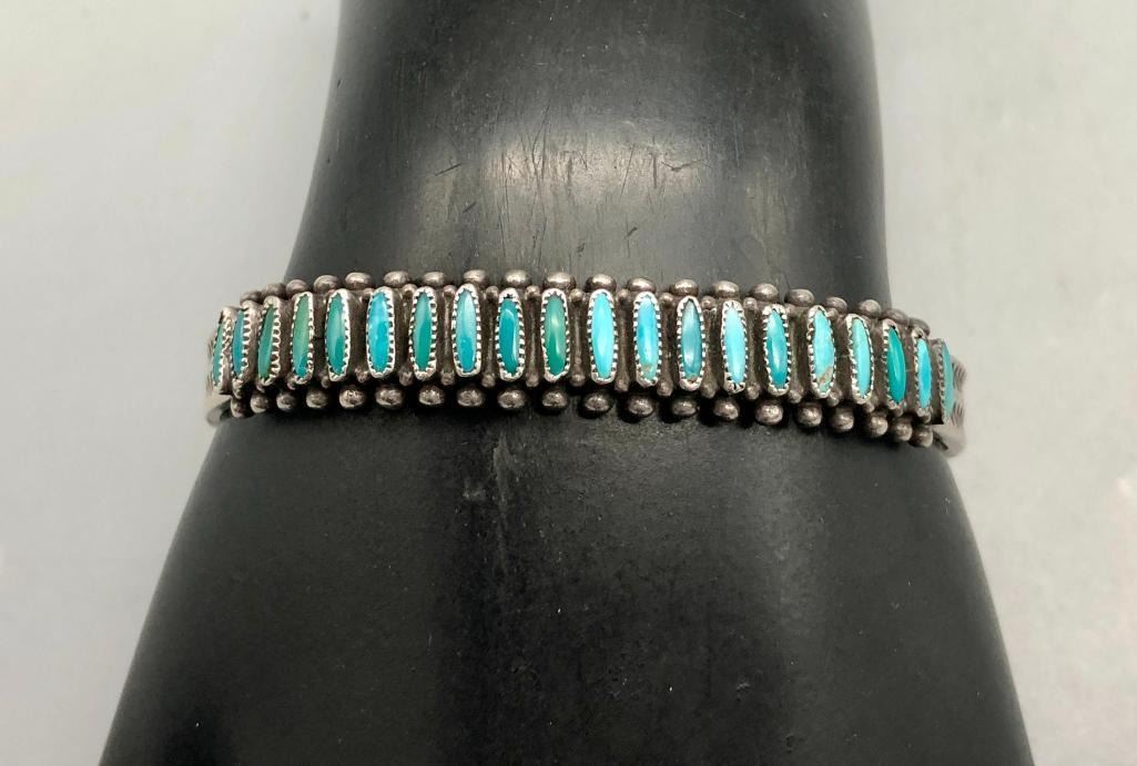 Up for consideration is a 1940s handmade turquoise needlepoint bracelet. It is set with 20 needlepoint turquoise stones (needlepoint is a term used when the stone is sharpened to a point on either end). It is accented with silver dots on the edges and hand stamped designs. It is sterling silver. MAKER: Unmarked. APPROX AGE: Circa 1940s. SIZE: Inside circumference measures 5-3/8 inches long. Opening is an additional 1-1/8 inch, fitting a 6-1/2 inch wrist. Width is 3/8 inches. Weighs 20.4 grams. CONDITION: Good for its age, normal wear expected. Please look closely at the pictures as they are an important part of our description and are hereby incorporated into the description, specifically with regards to condition. SHIPPING: There will be a $5 handling / packaging fee for shipping this lot. The actual cost of postage will be added on top of that. BUY IT NOW: If you would like to buy this item now, without waiting for the auction day to bid on it, we do offer this option (which is available up to 48 hours before the actual auction starts). The “Buy it Now†price is the high estimate of this lot (plus applicable fees and the Buyer's premium is discounted to 10% when using the Buy it Now option). If you would like to exercise this option, you must contact us by email (or phone as long as you talk to someone live). Reference this lot number and your intention to "Buy it Now."
