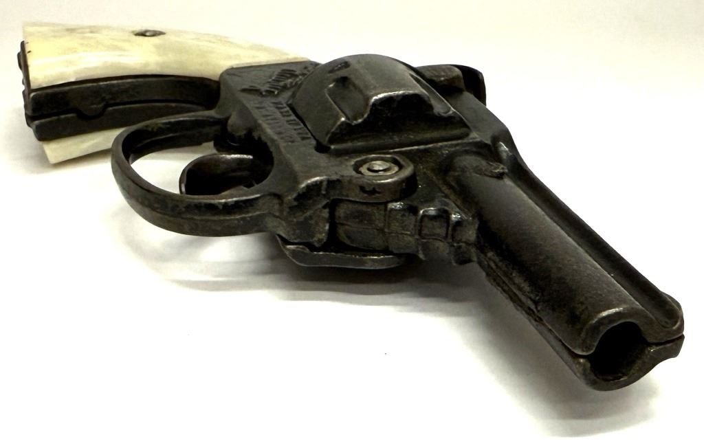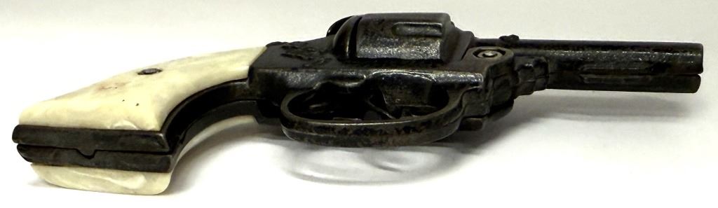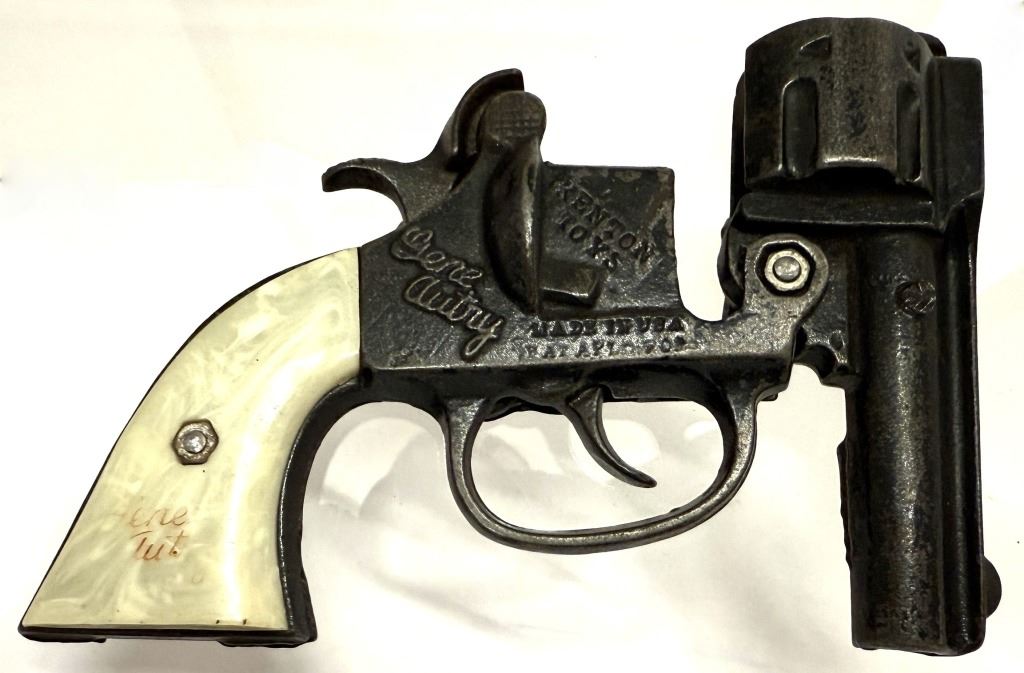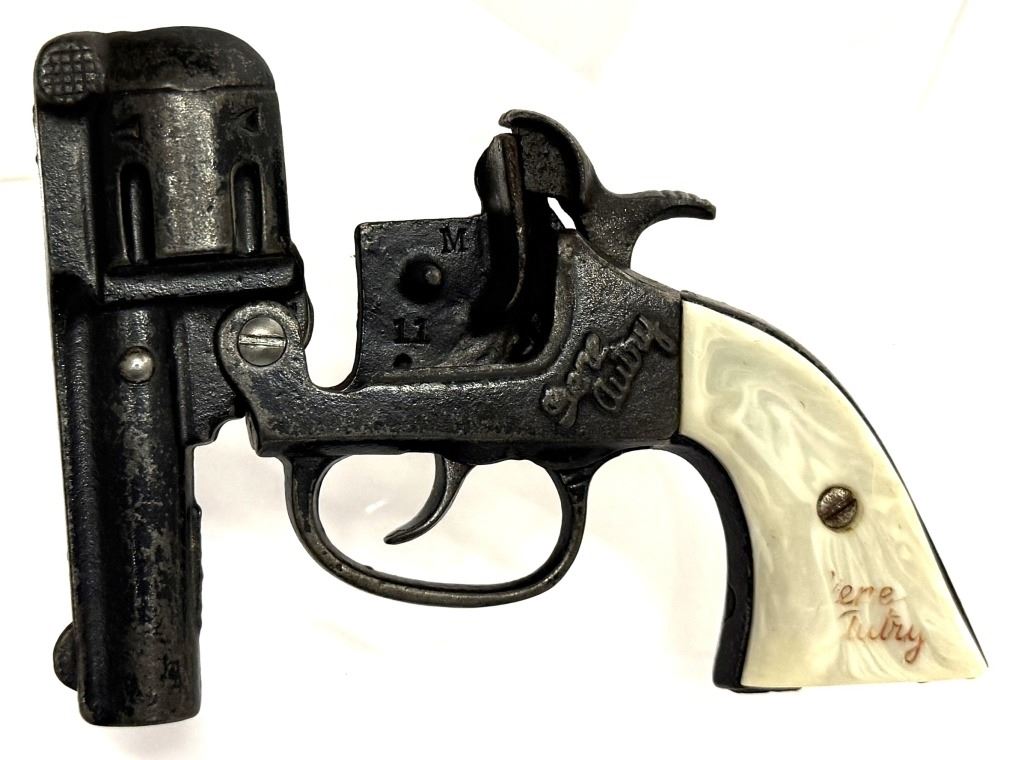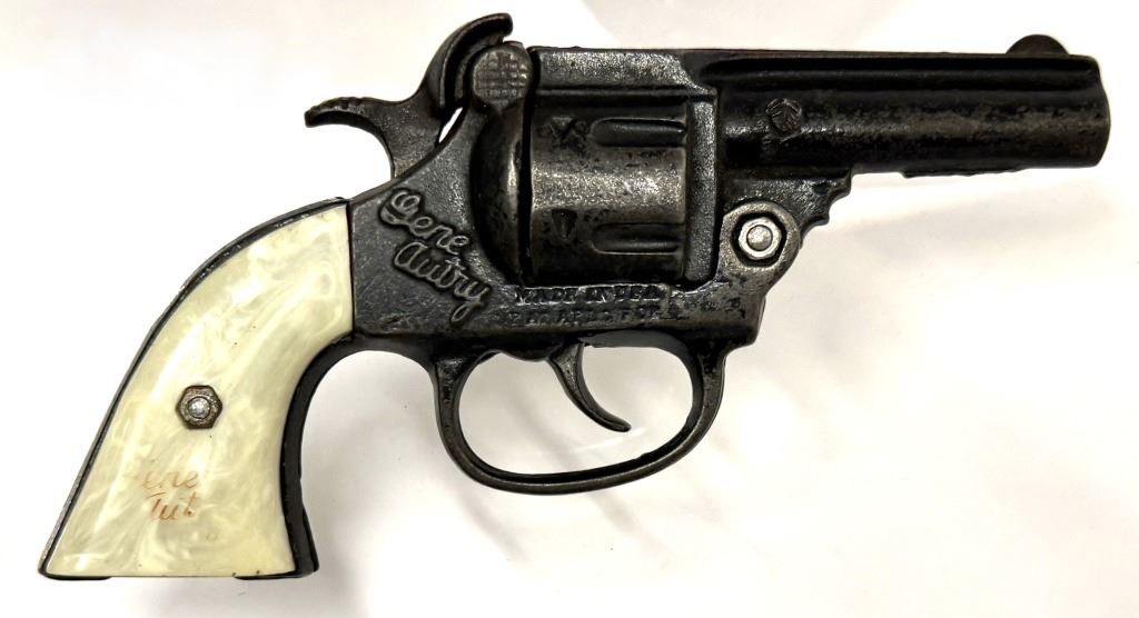Item/Description: Vintage Kenton Toys Gene Autry cast iron cap gun with with Gene Autry's signature cast into the metal and appearing in red on the faux ivory grips. Produced by Kenton Hardware Company, a leading maker of cast iron toys, in the 1940s. The contract to produce the "official" Gene Autry cap pistol is credited with saving the town of Kenton, Ohio, from economic disaster during the Great Depression.