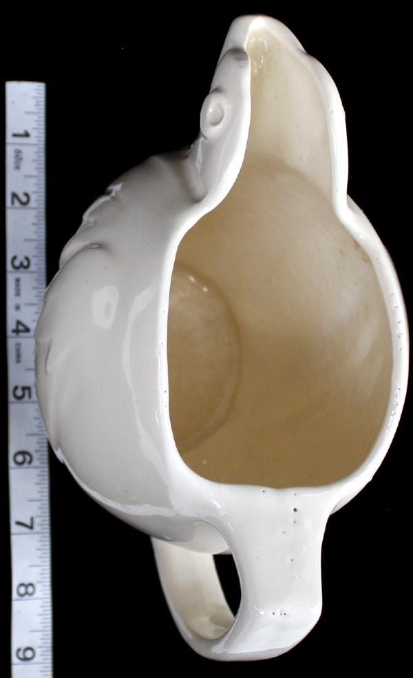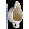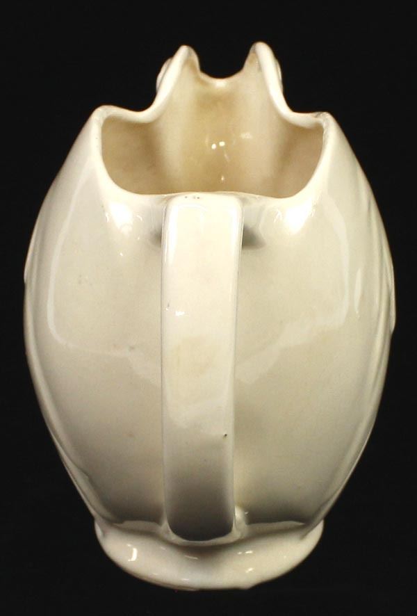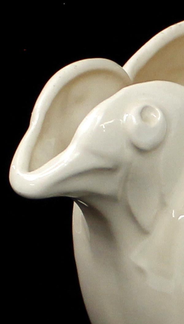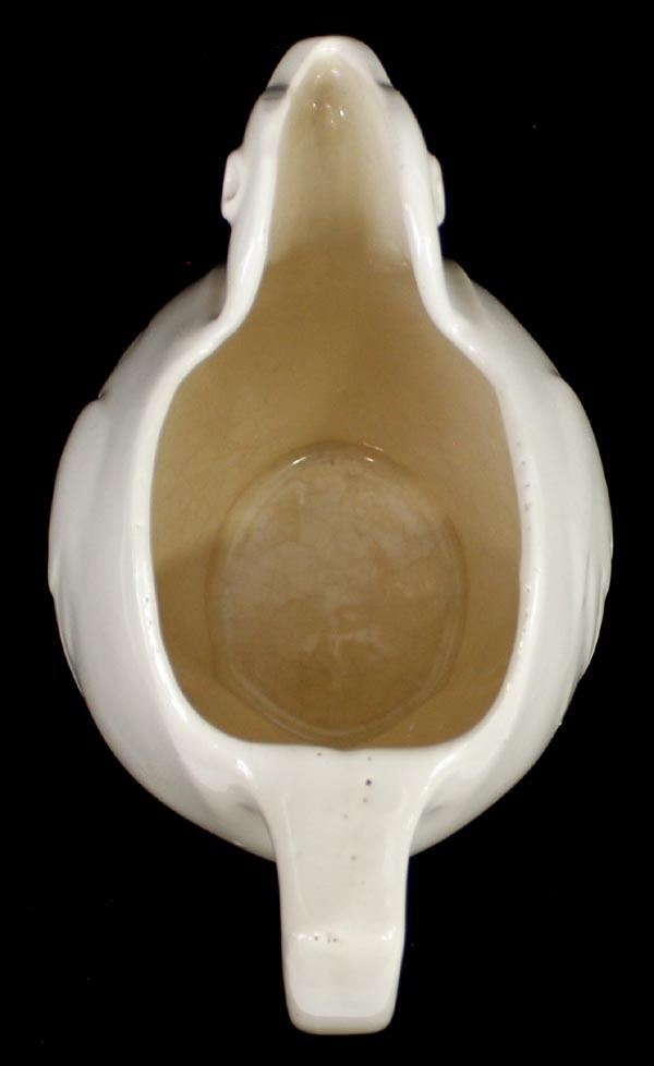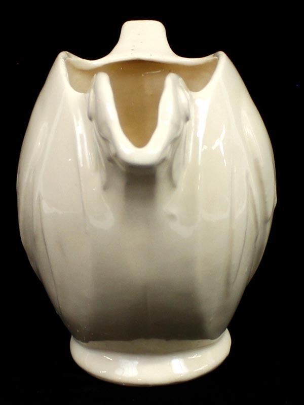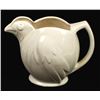 1940s McCoy Pottery Chicken Pitcher, measures 4.5'' x 6'' x 7'', ''This unmarked McCoy pottery piece is a milk pitcher, in the shape of a bird or chicken with the beak functioning as a spout. The piece is circa 1941, and can be found referenced on page 167 in Sanford's Guide to McCoy Pottery. Whimsical piece, and notice the way the bird appears to be looking up with an impish expression.''