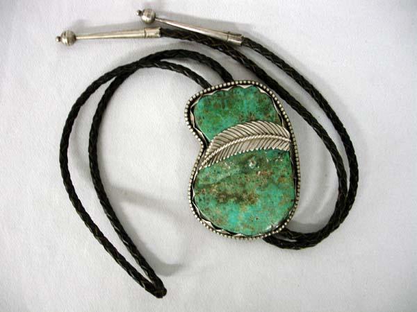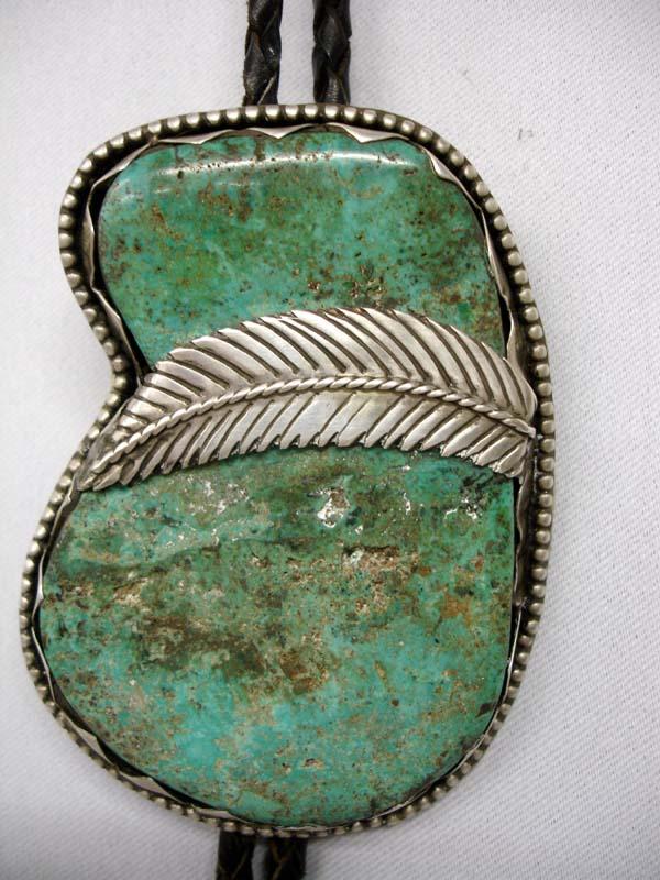 1940s Navajo Bolo Silver w/Large Turquoise Stone. Sterling backing and feather with large natural turquoise stone. Slide measures 3-3/4''x2-1/4''. Matrix has broken to outside in some places on the turquoise. Stamped on back, ''Sterling.'' Buyers Pay Actual Shipping and Handling Charges(see terms and conditions for more information).