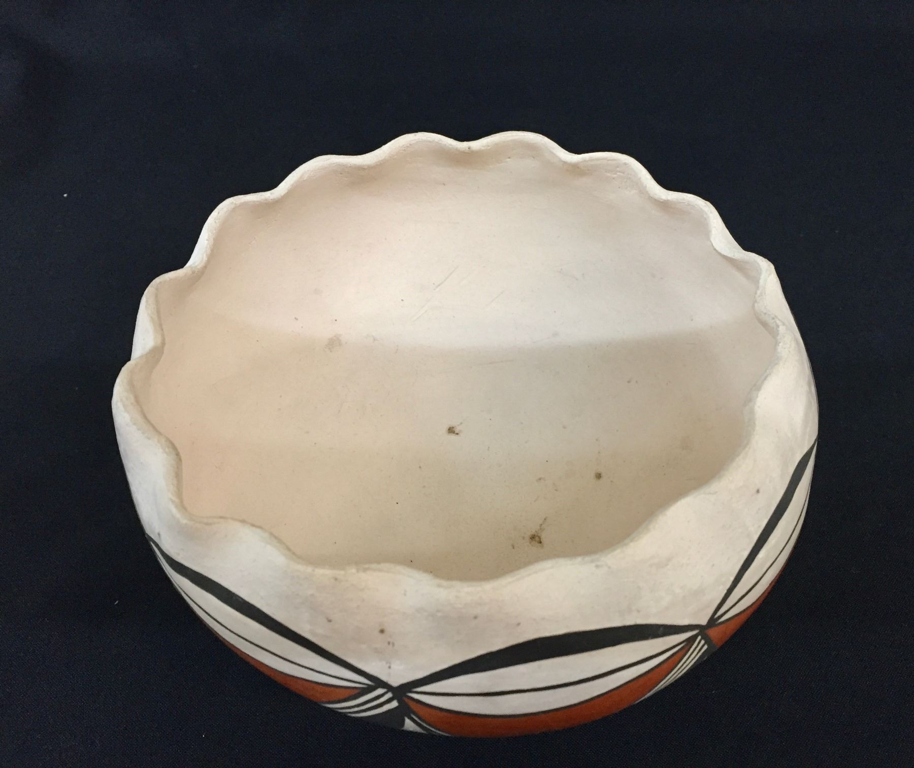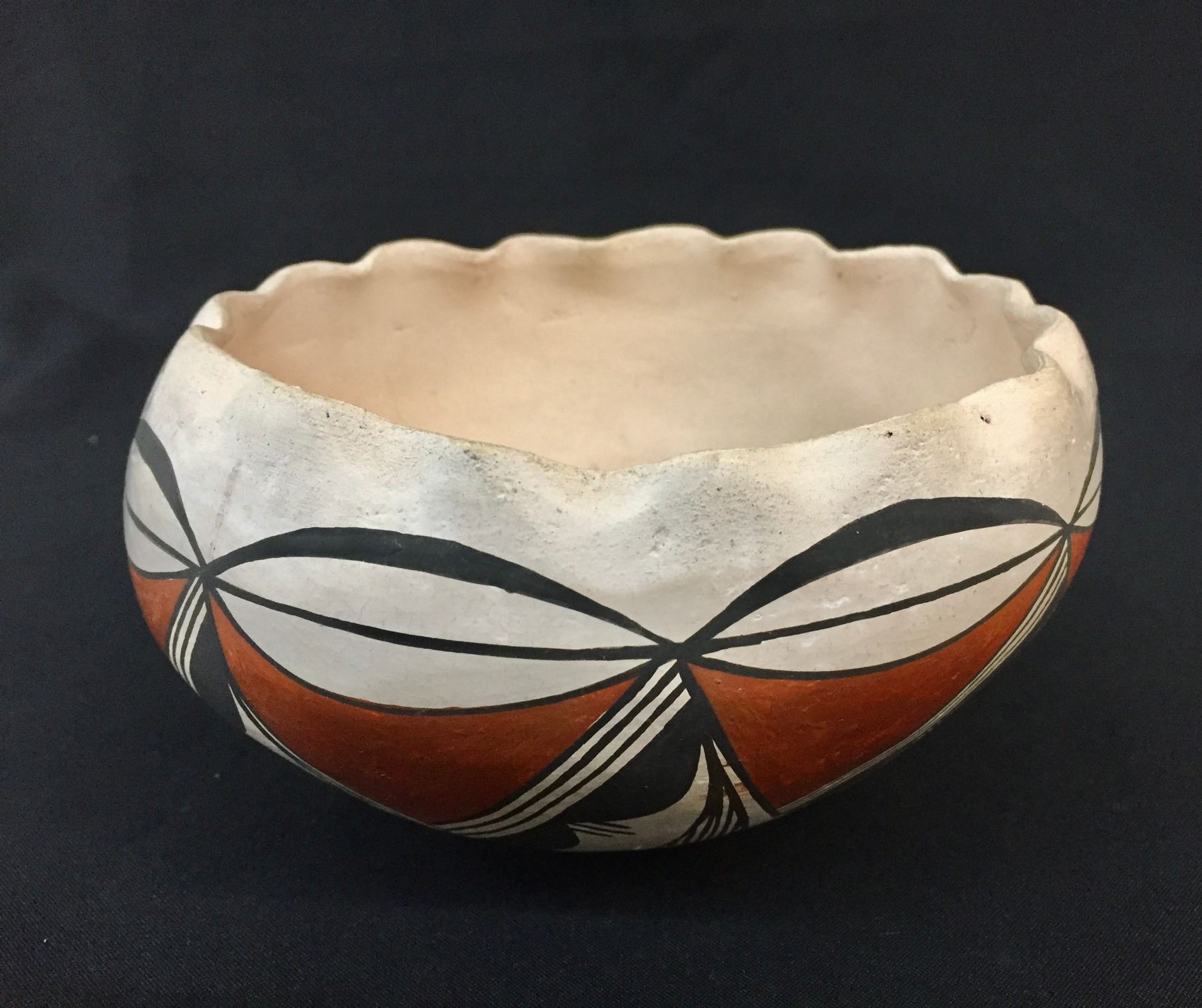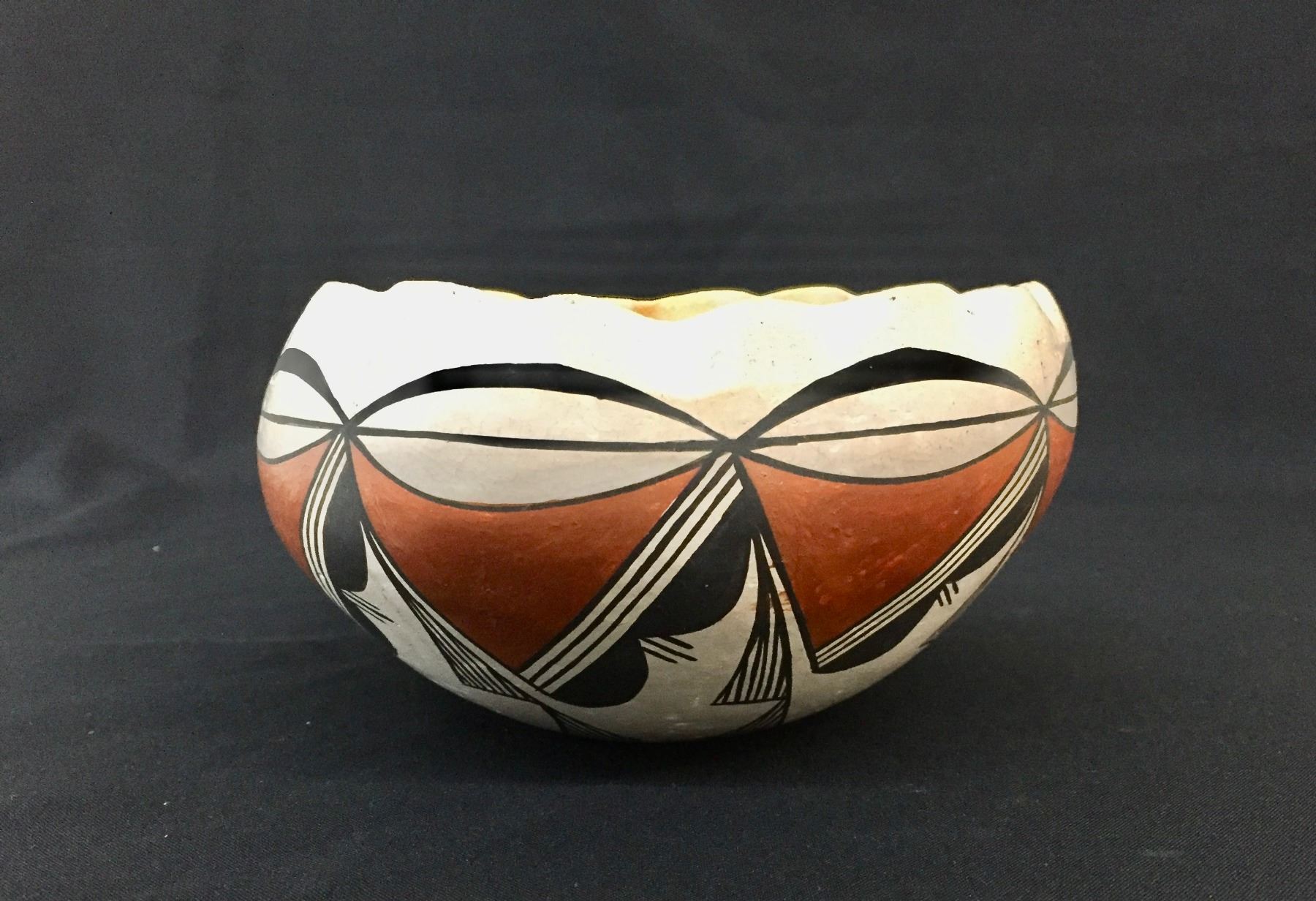 Description: For sale in this lot is an old, handmade Acoma pot. This pot features scalloped edges and hand painted geometric designs. Maker: Unknown Acoma potter. Approx. Age: 1940s. Size: 6-3/4”w x 3-1/2” tall. Condition: Good for its age, normal wear expected. Please look closely at the pictures - they are an important part of our description. Shipping: There will be a $10 handling / packaging fee for shipping this lot. The actual cost of postage will be added on top of that.