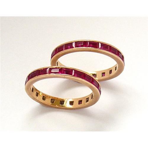 This lovely matching pair of bands features rectangular faceted channel set rubies. It has no marks, but tested to be 14Kt gold. They are 2.5mm wide each.