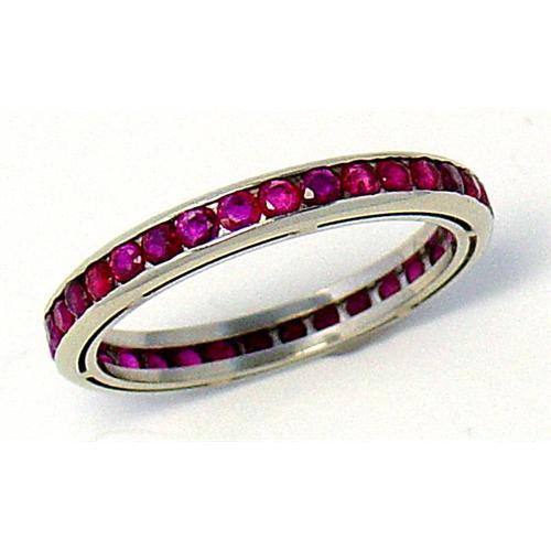 Hand crafted platinum band channel set with perfectly matched round rubies. It looks lovely by itself or in-between a pair of diamond bands. Great for stacking, too. It fits a finger size 6.75. 2.2mm wide