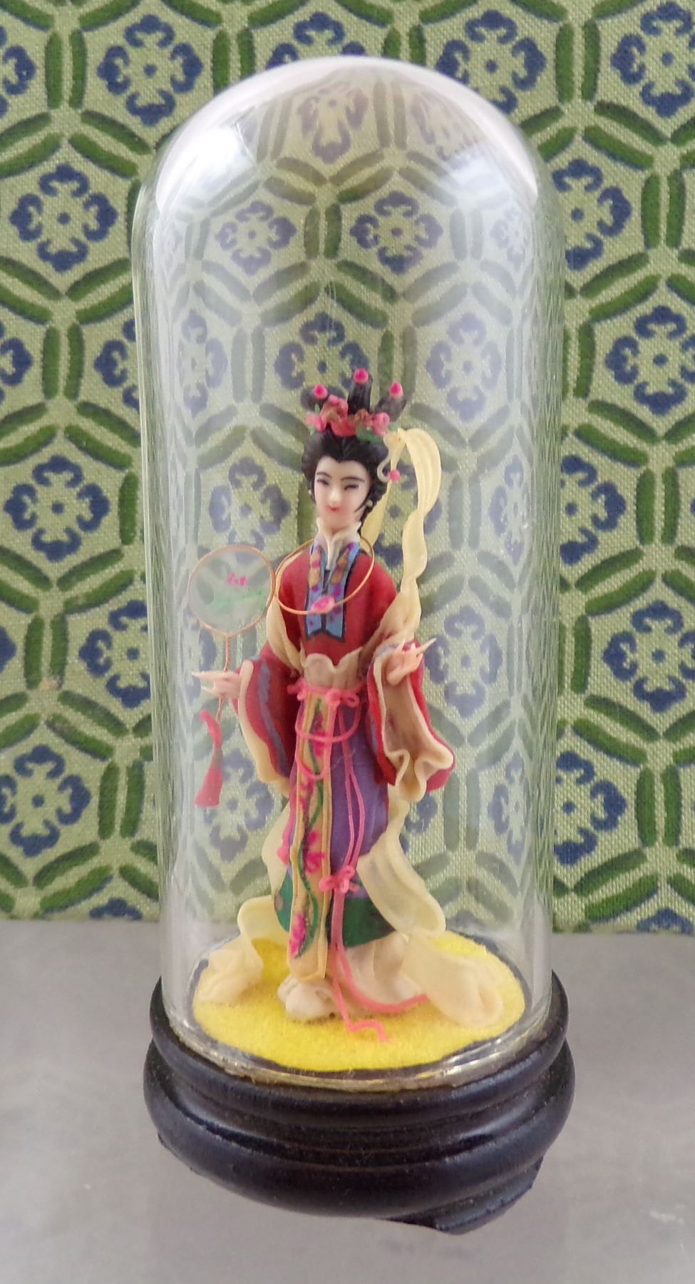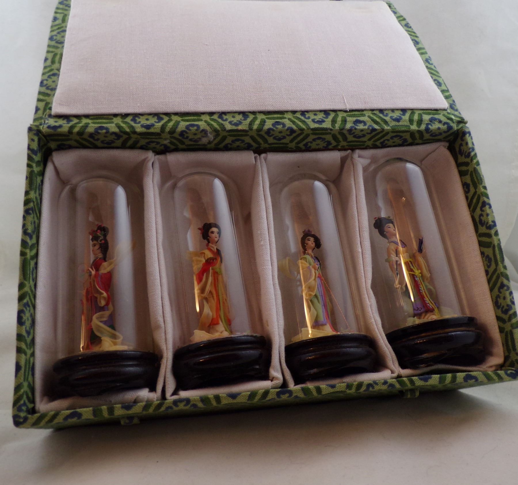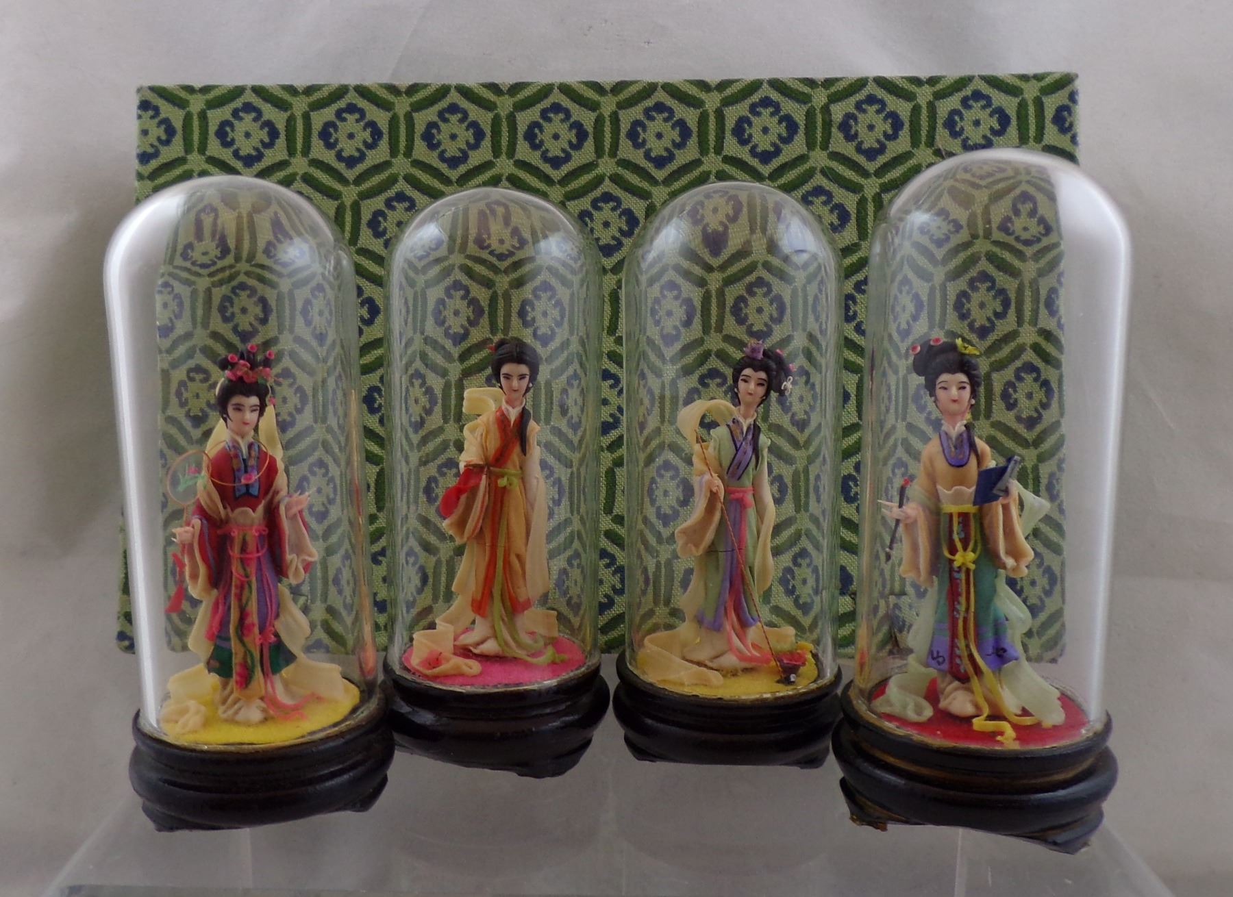 1940s Set of 4 Miniature Oriental Geisha Dolls, all in domed glass bell jar displays, come in silk box, box measures 7.25''L x 4.25''W x 2.25''H, dolls measure 3.5''H x 1.5''D, one of the dolls has a loose piece off of her head