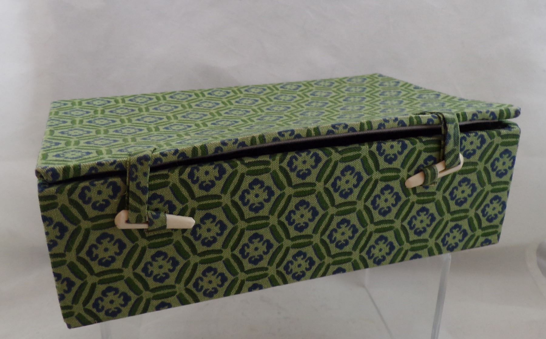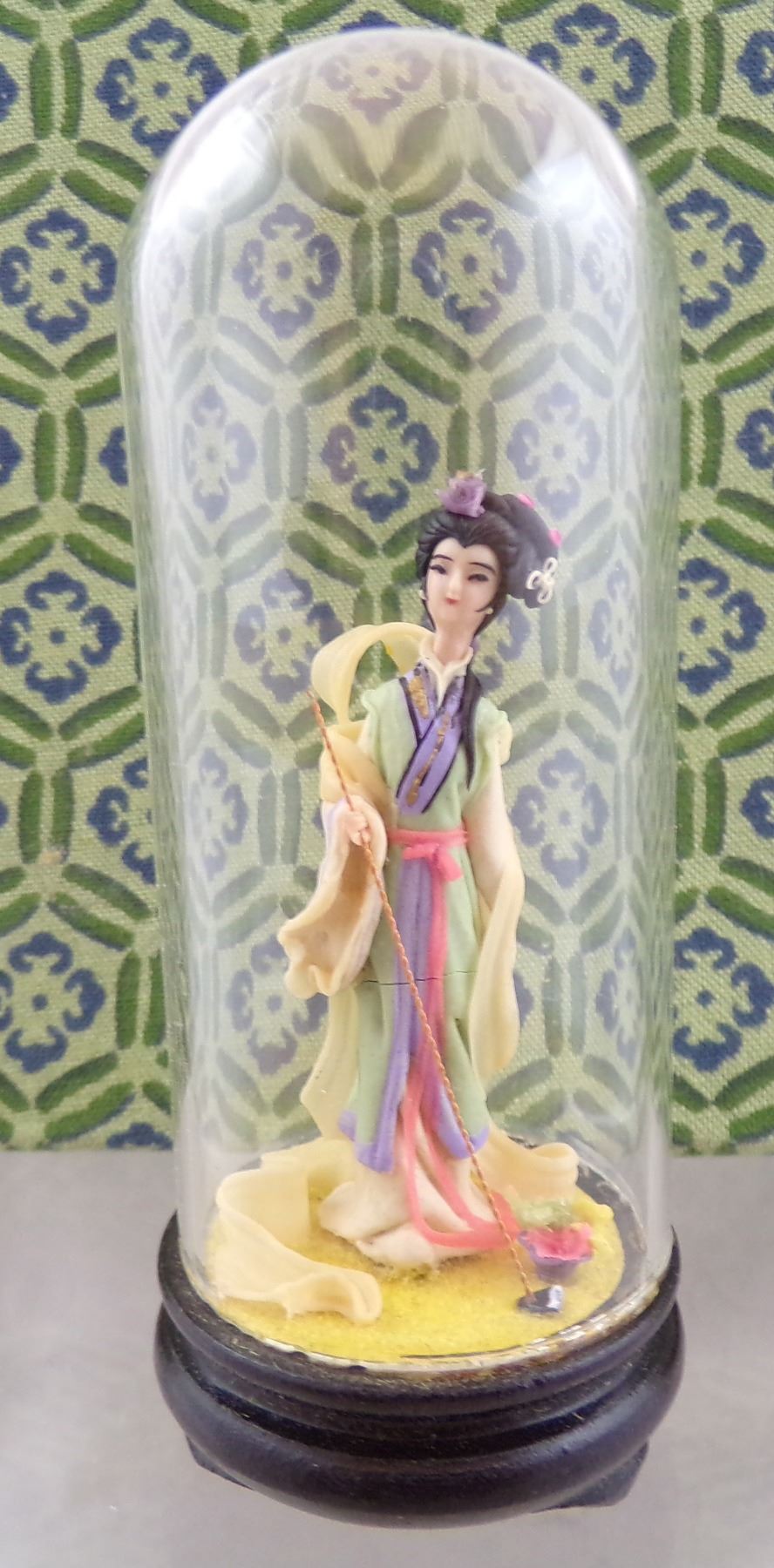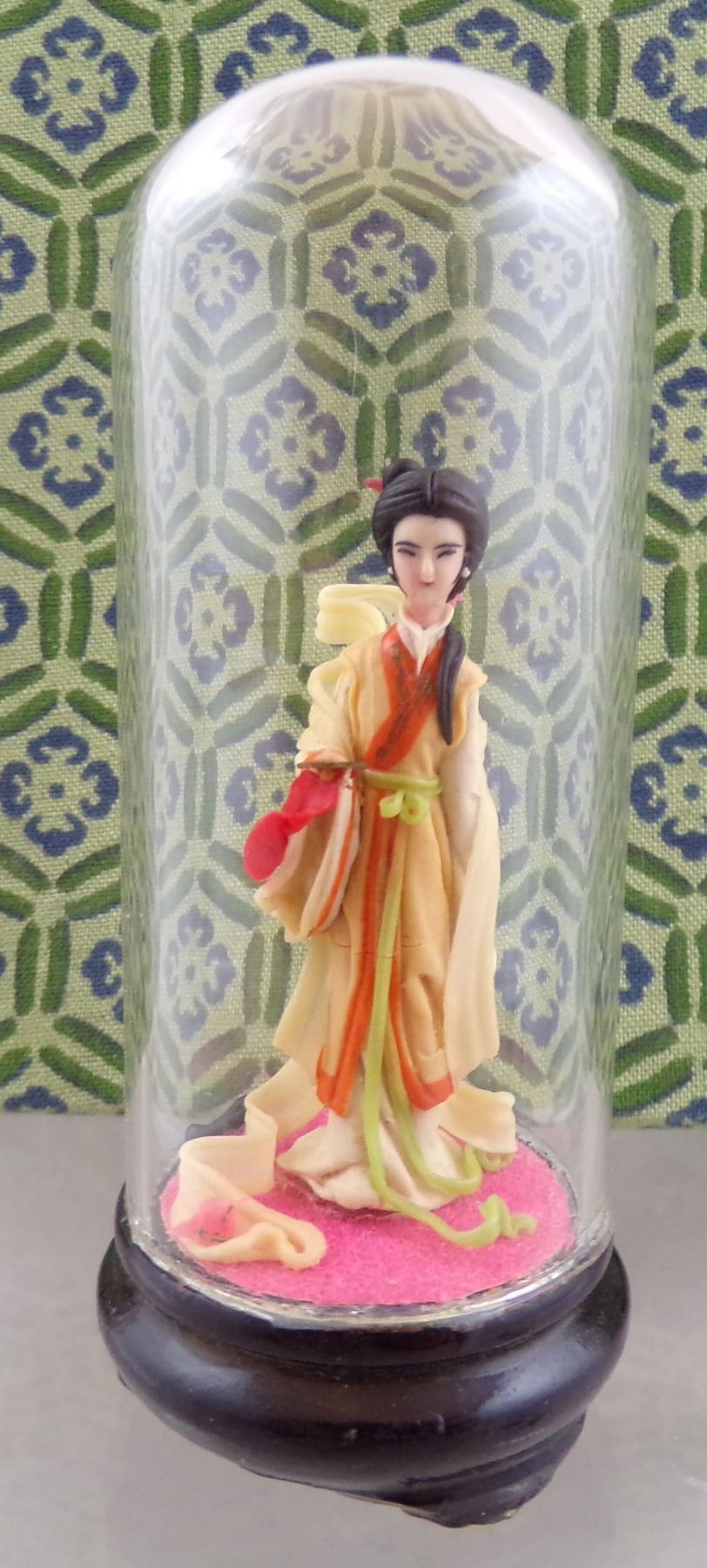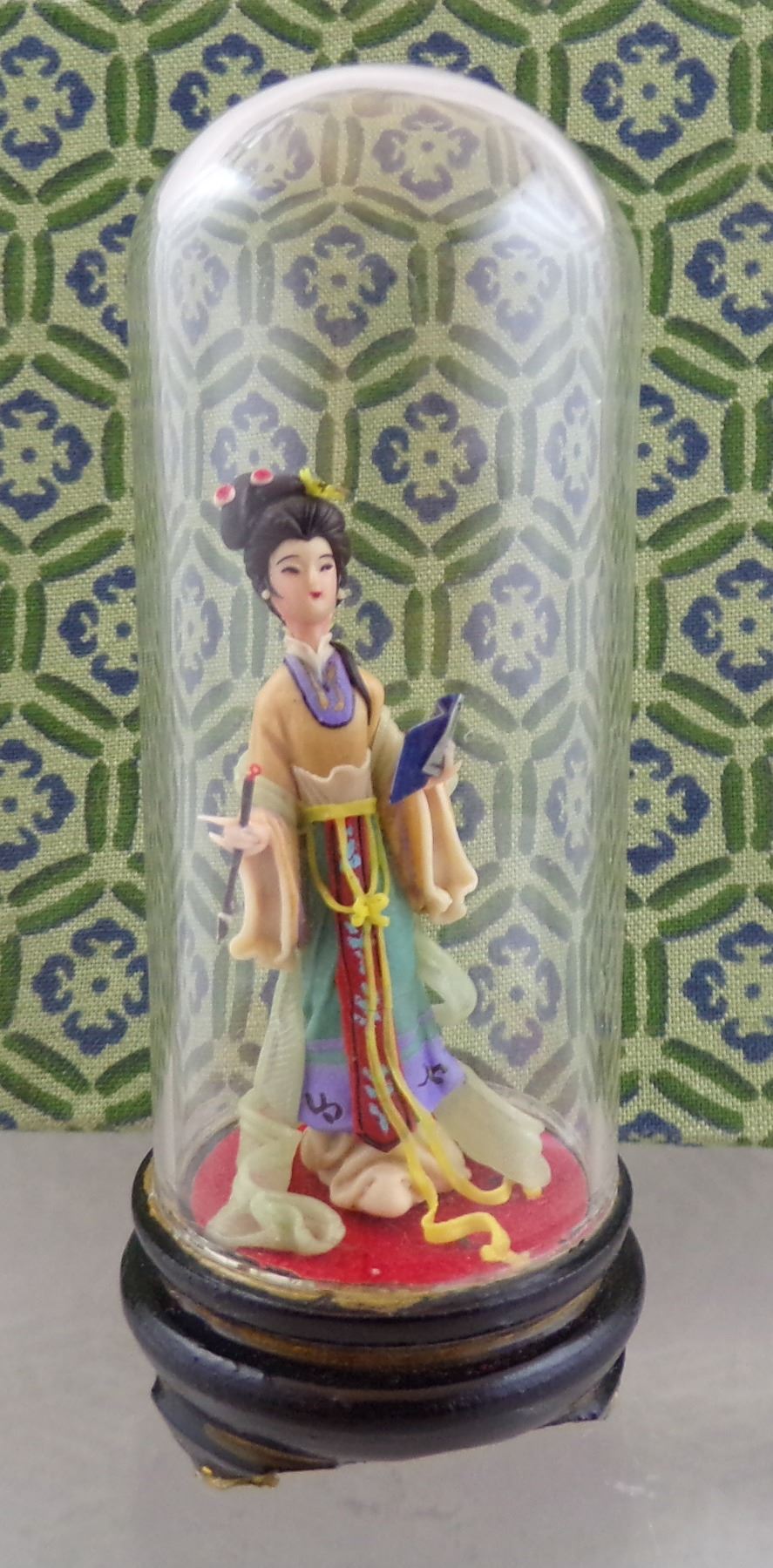 1940s Set of 4 Miniature Oriental Geisha Dolls, all in domed glass bell jar displays, come in silk box, box measures 7.25''L x 4.25''W x 2.25''H, dolls measure 3.5''H x 1.5''D, one of the dolls has a loose piece off of her head