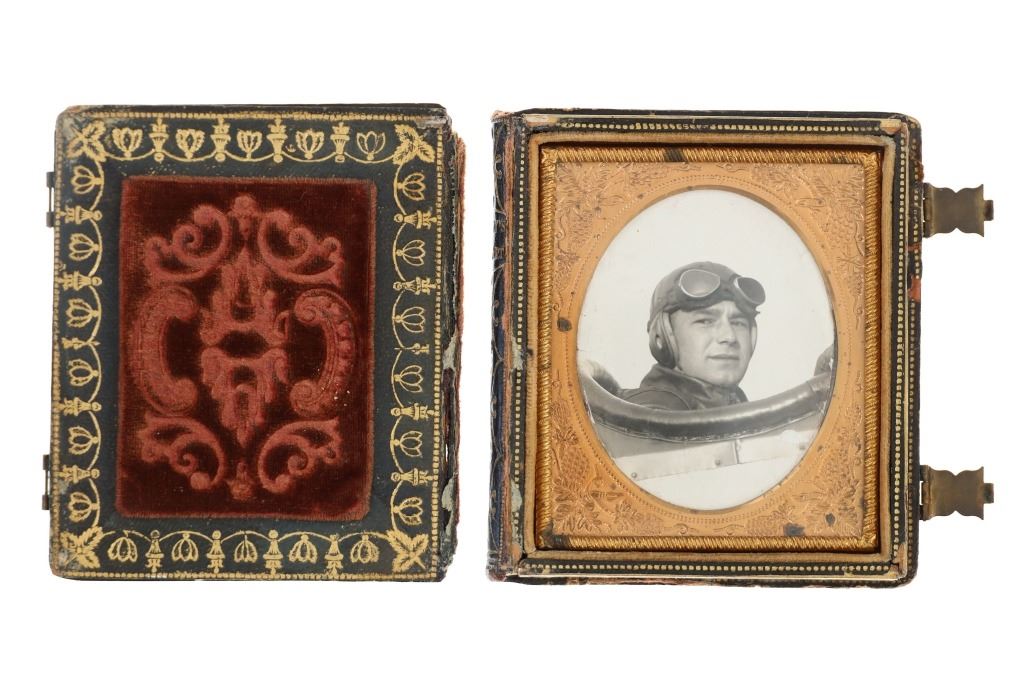 Featured in this lot is this early 1900s cased image of four-star General Joseph Taggart McNarney circa 1940-1950s. A distinguished United States Army officer, Joseph Taggart McNarney rose through the ranks to become a four-star general. He was a significant contributor to various military operations and administrative positions both during and after World War I and II. He was born on August 28, 1893, in Emporium, Pennsylvania. In 1915, McNarney received his diploma from the United States Military Academy at West Point. During World War I, he served in a number of positions, including as the commander of a machine gun company and later as a staff officer. Throughout the interwar years, McNarney advanced through the ranks, eventually earning degrees from the Army War College and the Command and General Staff School. McNarney played a significant part in World War II. He worked for General Dwight D. Eisenhower, as the supreme commander of the Allied Expeditionary Force in Europe. As a result, McNarney played a crucial role in organizing and carrying out the Allied invasion of Normandy on D-Day (June 6, 1944), which led to the liberation of Western Europe from Nazi rule. The success of these campaigns was greatly influenced by his leadership and contributions. After the war, McNarney was chosen to serve as Germany's Deputy Military Governor during the occupation, helping to stabilize and rebuild the nation. He rose to vice chief of staff of the US Army in 1947. McNarney served as both the United States representative to the United Nations Military Staff Committee and the Supreme Allied Commander of the Mediterranean during the Korean War. In spite of his 1952 retirement from active duty, McNarney remained active in a number of government and military-related endeavors. From 1952 to 1954, he represented the United States on the Military Committee of the North Atlantic Treaty Organization (NATO). After leaving the military, McNarney had a prosperous business career and was a member of the boards of several companies. On February 1st, 1972, he passed away in La Jolla, California. The photo is set in a gorgeous case with the front cover showing floral designs inlaid with mother of pearl and surrounded by flowers, vines and leaves. On the backside of the front cover is a red felt cushion to help protect the glass cover and the photo. The area surrounding the photo shows a gold colored frame with floral-like designs throughout. The portrait photos shows Major McNarney in the open cockpit of a biplane, wearing a flying helmet and goggles as he looks towards the viewer. The photo is glued directly onto an old copper daguerreotype plate. The photo shows good condition overall with some slight wear present, while the case exhibits some damage and wear as the front cover is completely detached from the case. The case measures 3 7/8" L x 3 5/8" W x 5/8" H and weighs 132.6 grams.*
