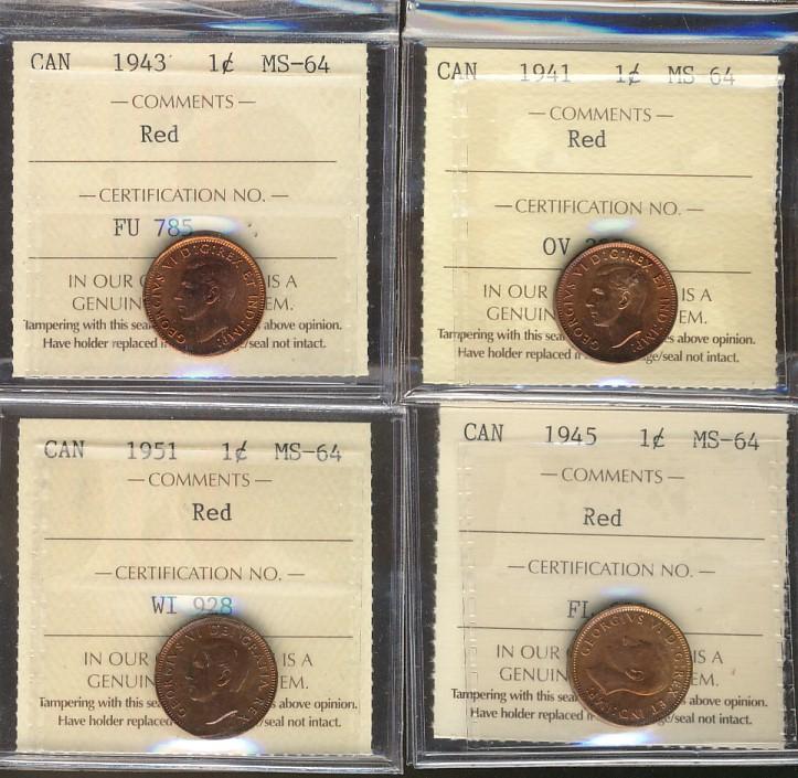 1941 1¢, 1943, 1945 & 1951 ICCS MS64RD. Lot of 4 coins.