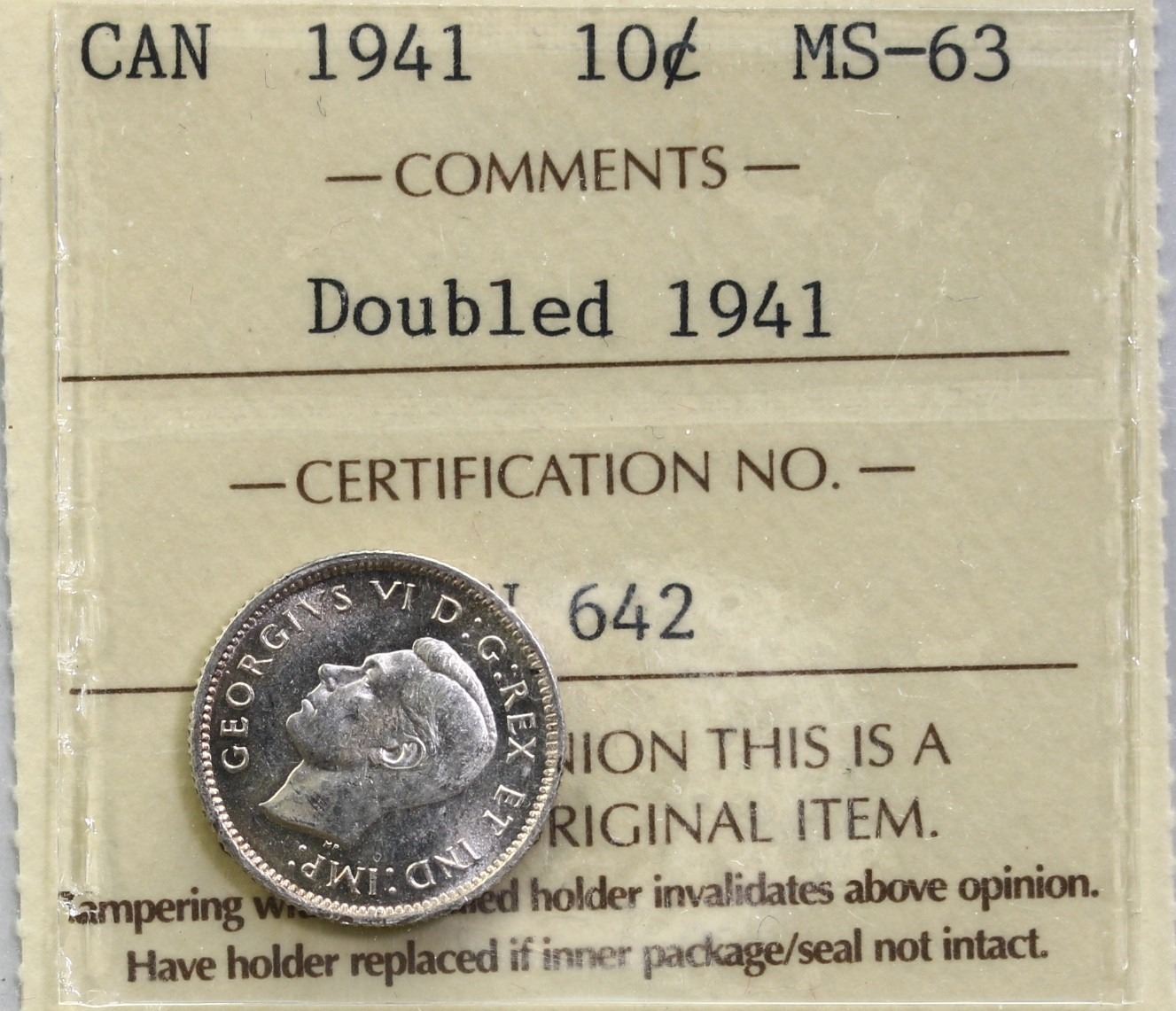 1941 10¢ "Dbl 1941" ICCS Choice Mint State-63. A truly impressive example with a fully doubled date, unlisted in trends. Amazing luster enhances this already desirable gem, surely one of the only examples graded with a fully doubled date and likely the finest among the few. A very exiting coin for collectors of this series and their varieties, don't let this one get away! A 1938 "Dbl 193" in Choice Mint State-64 brought it $896 at the 2025 Summer Sale.