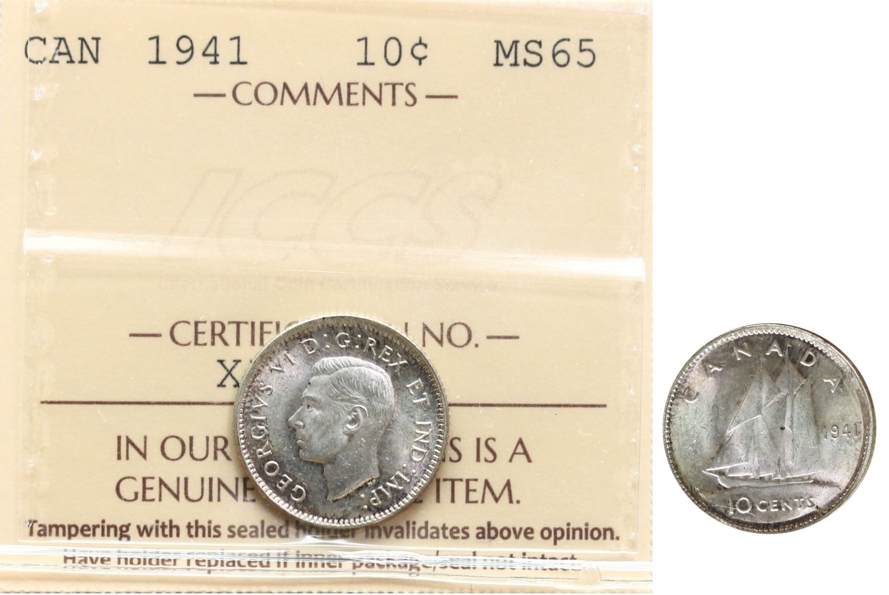 1941 10¢ ICCS Gem Mint State-65, Hint of russet tone over full underlying lustre. A scarce date.