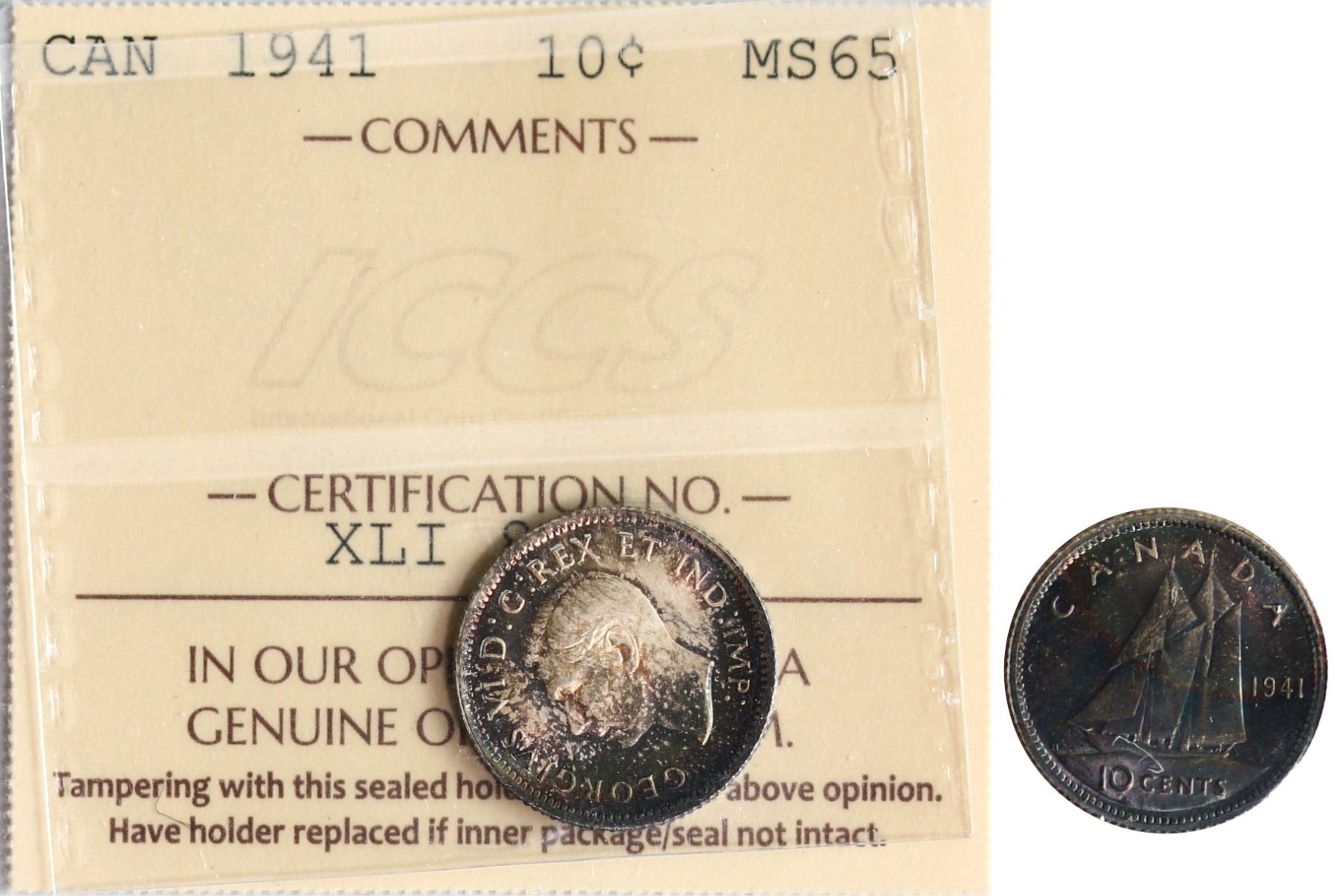 1941 10¢ ICCS Gem Mint State-65, Superb toning over full underlying lustre