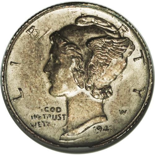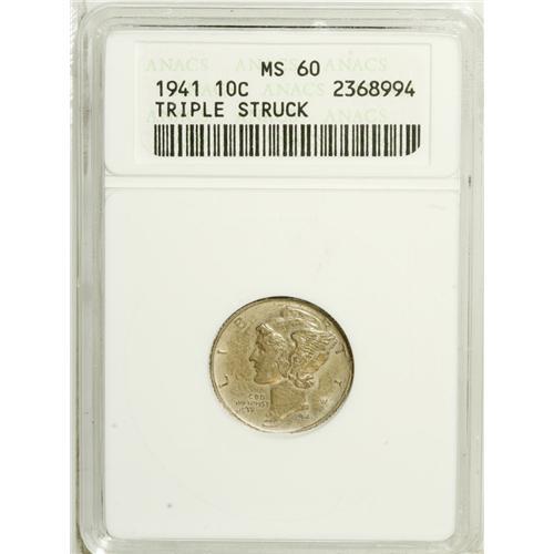 <B>1941 10C Mercury Dime--Triple Struck--MS60 ANACS.</B></I> Light chestnut-gray toning drapes well struck motifs. The best evidence of three strikes is the second S in STATES. There is a ghostly impression of the top half of the letter from the first strike, a sharper top half of the S from the second strike beneath the first strike, and finally, a nearly fully defined S from the third strike, beneath the first two lighter impressions. LIB and UNITED from the final strikes are virtually absent, which gives the left fields an unusually wide appearance.<BR><BR><b>Shipping:</b> Coin/Currency (<a target="_blank" href="http://www.heritageauctions.com/common/shipping.php">view shipping information</a>)