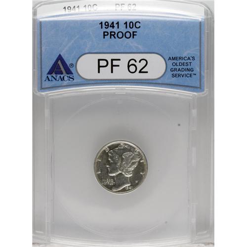 <B>1941 10C PR62 ANACS.</B></I> NGC Census: (26/4446). PCGS Population (52/3684). Mintage: 16,557. Numismedia Wsl. Price for NGC/PCGS coin in PR62: $121. (#5076)<BR><BR><b>Shipping:</b> Coins & Currency (<a target="_blank" href="http://www.heritageauctions.com/common/shipping.php">view shipping information</a>)