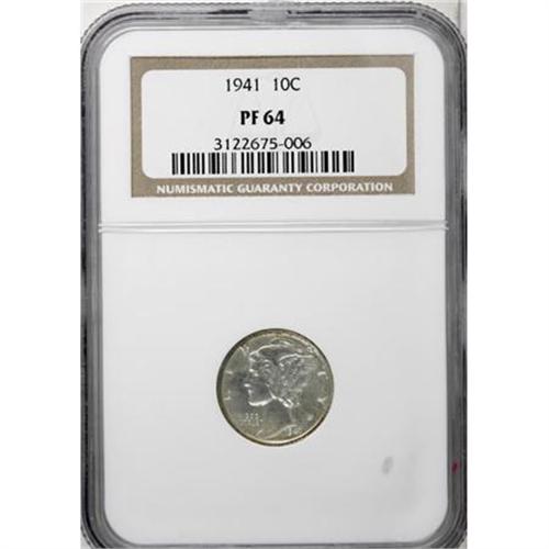 <B>1941 10C PR64 NGC.</B></I> . NGC Census: (351/1941). PCGS Population (880/2614). Mintage: 16,557. Numismedia Wsl. Price for NGC/PCGS coin in PR64: $185. (#5076)<BR><BR><B>Coin Engraver:</B> Adolph A. Weinman<BR><BR><b>Shipping:</b> Coins & Currency (<a target="_blank" href="http://www.heritageauctions.com/common/shipping.php">view shipping information</a>)