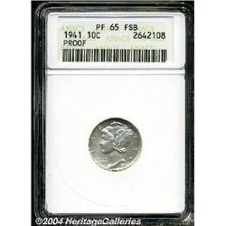 <B>1941<10C> PR65 Full Bands ANACS.</B></I> This exquisitely struck Gem has splendid surfaces and milky tan and sky-blue colors. A lovely souvenir from the year the U.S. entered World War II. <BR><BR><B>Important notice:</B> Heritage usually auctions material at the rate of 200-250 lots per hour. On some occasions eBay Live bid software or the Internet may not be able to keep up with the pace of the auction. We recommend placing a realistic absentee bid now as insurance to avoid disappointment. Occasionally the auctioneer may eliminate or reject an eBay Live bid, and the auctioneer may also reopen a lot after the close of the eBay live bidding (usually because we missed an audience bid), and may reject your bid even if it shows you as the winning bidder. By bidding via eBay Live, you agree that Heritage may award the lot to another bidder at its sole discretion under the circumstances described above or any other reasonable circumstances. Since eBay bids are not shown to us until we open the lot on the floor, we treat those bids just like floor bids. In most cases the floor responds before the eBay bid is presented to us, due to Internet lag time, so for consistency we have made it a policy that floor bids are always considered first over tie eBay live bids. Also please note that all Heritage lots purchased through eBay Live carry a 20% Buyer's Premium. Please make sure you read the Terms and Conditions before you bid.