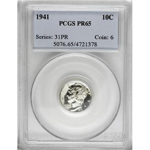 <B>1941 10C PR65 PCGS.</B></I> PCGS Population (1315/1312). NGC Census: (655/1289). Mintage: 16,557. Numismedia Wsl. Price for NGC/PCGS coin in PR65: $250. (#5076)<BR><BR><B>Coin Engraver:</B> Adolph A. Weinman<BR><BR><b>Shipping:</b> Coins & Currency (<a target="_blank" href="http://www.heritageauctions.com/common/shipping.php">view shipping information</a>)
