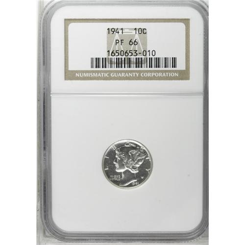 <B>1941 10C PR66 NGC.</B></I> NGC Census: (869/318). PCGS Population (975/300). Mintage: 16,557. Numismedia Wsl. Price for NGC/PCGS coin in PR66: $304. (#5076)<BR><BR><b>Shipping:</b> Coin/Currency (<a target="_blank" href="http://www.heritageauctions.com/common/shipping.php">view shipping information</a>)