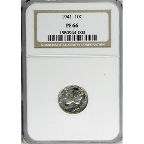 <B>1941 10C PR66 NGC.</B></I> NGC Census: (880/320). PCGS Population (987/301). Mintage: 16,557. Numismedia Wsl. Price for NGC/PCGS coin in PR66: $292. (#5076)<BR><BR><B>Coin Engraver:</B> Adolph A. Weinman<BR><BR><b>Shipping:</b> Coins & Currency (<a target="_blank" href="http://www.heritageauctions.com/common/shipping.php">view shipping information</a>\)