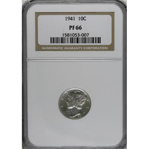 <B>1941 10C PR66 NGC.</B></I> NGC Census: (885/323). PCGS Population (989/302). Mintage: 16,557. Numismedia Wsl. Price for NGC/PCGS coin in PR66: $292. (#5076)<BR><BR><B>Coin Engraver:</B> Adolph A. Weinman<BR><BR><b>Shipping:</b> Coins & Currency (<a target="_blank" href="http://www.heritageauctions.com/common/shipping.php">view shipping information</a>)